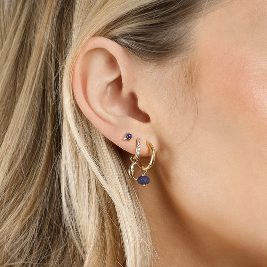 If you’re creating an earring stack with multiple ear piercings, make sure your other earrings are also on the dainty side, like small studs and huggies. For example, begin with a thread drop like our Signature Threads and pair them with huggies, like our Darcy Huggies, and studs like our gorgeous Ella Studs.